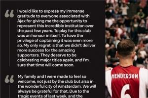 亨德森告别信:为阿贾克斯效力是我的荣幸,遗憾未带来更多成功