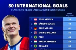 国家队最快达50球所用场次:哈兰德46场第4、梅西107场和C罗114场